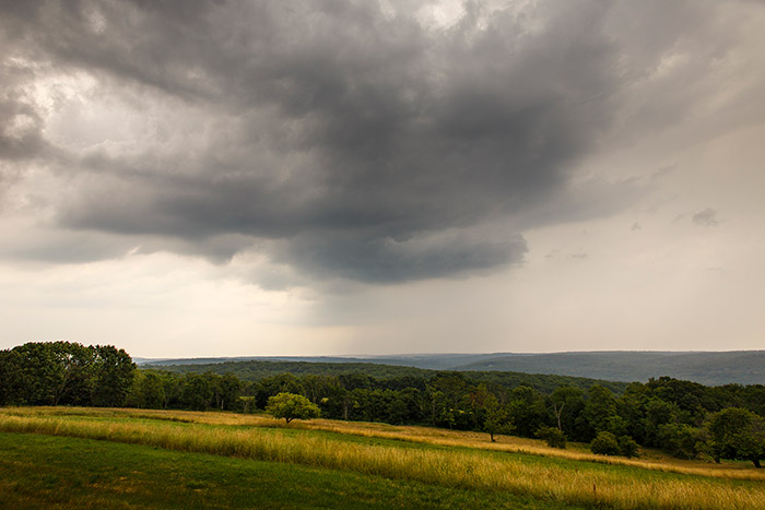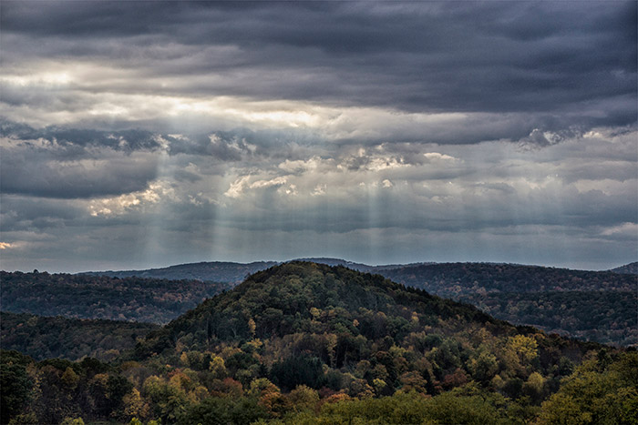 A lone cloud hurries over the landscape. Rays of light stream through the cloud cover. Enormous billows range overhead. Light breaks on the horizon. One need only stand on a hilltop to capture the view.